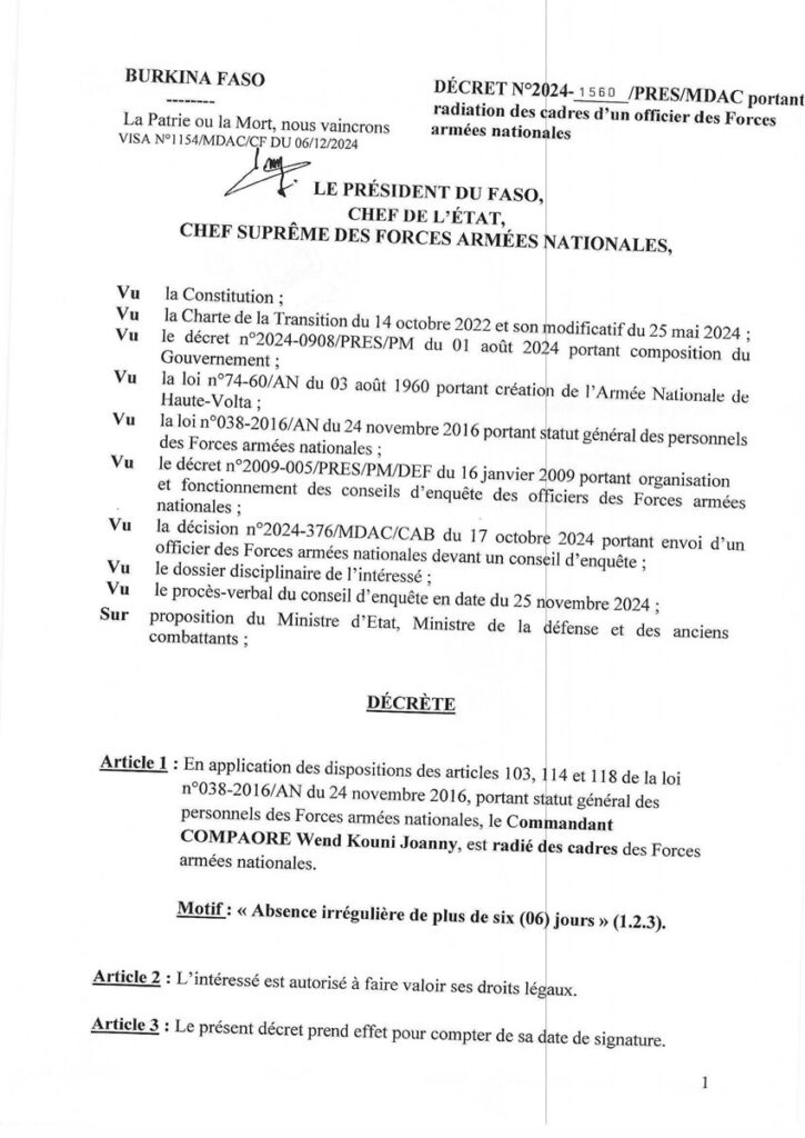 Les concernés sont le commandant Boumbéwenné Hermann Zongo et le commandant Wendyam Kouni Joanny Compaoré. Selon les informations officielles, leur radiation fait suite à une absence du service sans justification valable, dépassant la durée réglementaire de six jours. Cette sanction, la plus lourde envisageable, souligne l’importance accordée par les autorités à la discipline et à la présence effective des militaires en poste.