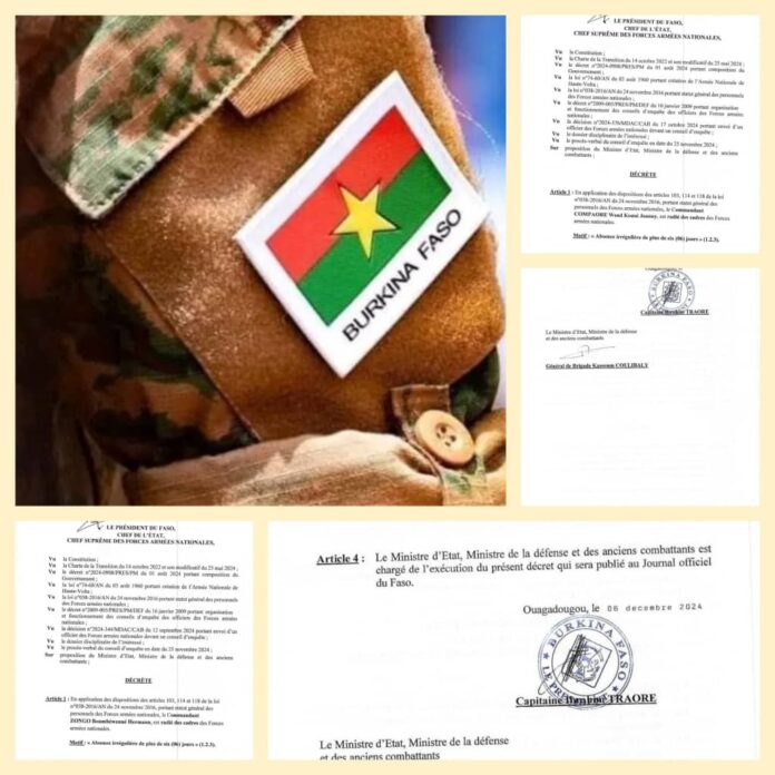 Le président du Faso, le capitaine Ibrahim Traoré, a radié deux commandants des Forces Armées Nationales (FAN) pour absence irrégulière. Cette décision, officialisée par deux décrets distincts en date du 6 décembre 2024, marque une nouvelle étape dans la politique de fermeté menée par le gouvernement face aux manquements disciplinaires au sein de l’armée.