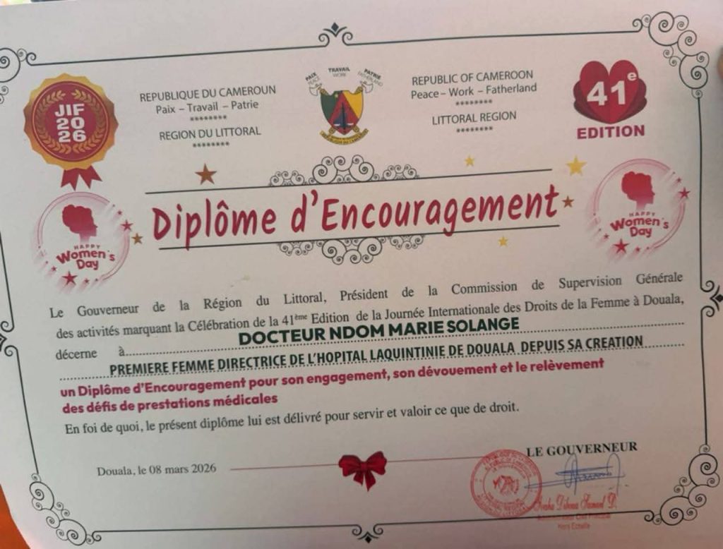 La Journée Internationale de la Femme a résonné avec une intensité particulière ce 8 mars 2026 à Douala, où le Dr Marie Solange Ndom-Ebongue, Directrice de l’Hôpital Laquintinie, a été doublement honorée pour ses indéniables contributions à la santé publique et pour son modèle de leadership. Dans une cérémonie empreinte d’émotions et de valeurs humanistes, Dr Ndom-Ebongue s’est vu remettre, en présence de nombreuses personnalités, deux distinctions majeures, symboles d’une reconnaissance tant professionnelle que sociale.