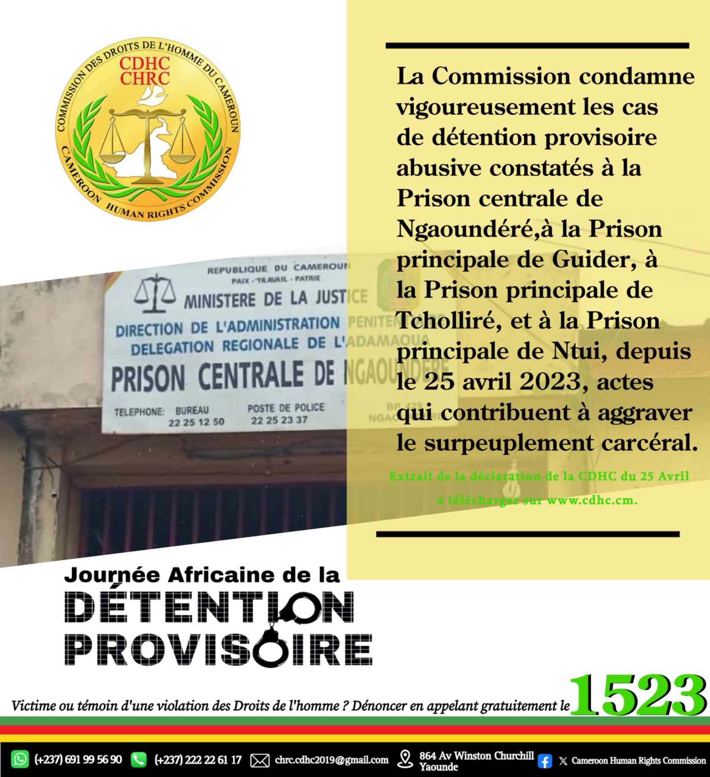 La Commission condamne vigoureusement les cas de détention provisoire abusive constatés à la Prison centrale de Ngaoundéré, à la Prison principale de Guider, à la Prison principale de Tcholliré, et à la Prison principale de Ntui, depuis le 25 avril 2023, actes qui contribuent à aggraver le surpeuplement carcéral.