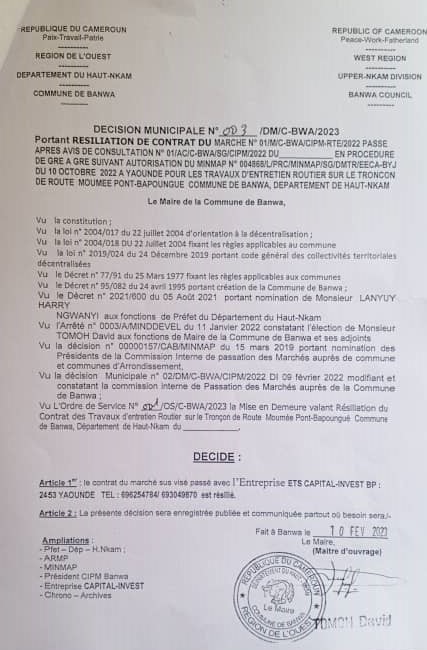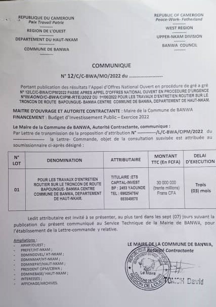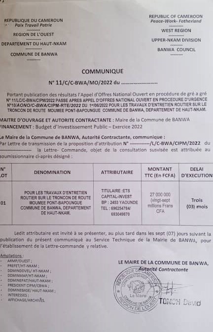 Au centre du mécontentement, « le refus délibéré entre autres du maire d’attribuer le marché public à Pierre Kwemo, de peur que ce marché tombe encore dans la forclusion comme celui d’électrification du village Bamelec en 2022. Ainsi que ceux d’entretien routier sur le tronçon route Moumée pont – Bapoungue commune de banwa pour un montant de 27 millions de francs cfa, et le tronçon route Bapoungue – Banwa centre commune de Banwa pour un montant de 30 millions de francs cfa, toujours en 2022 ».