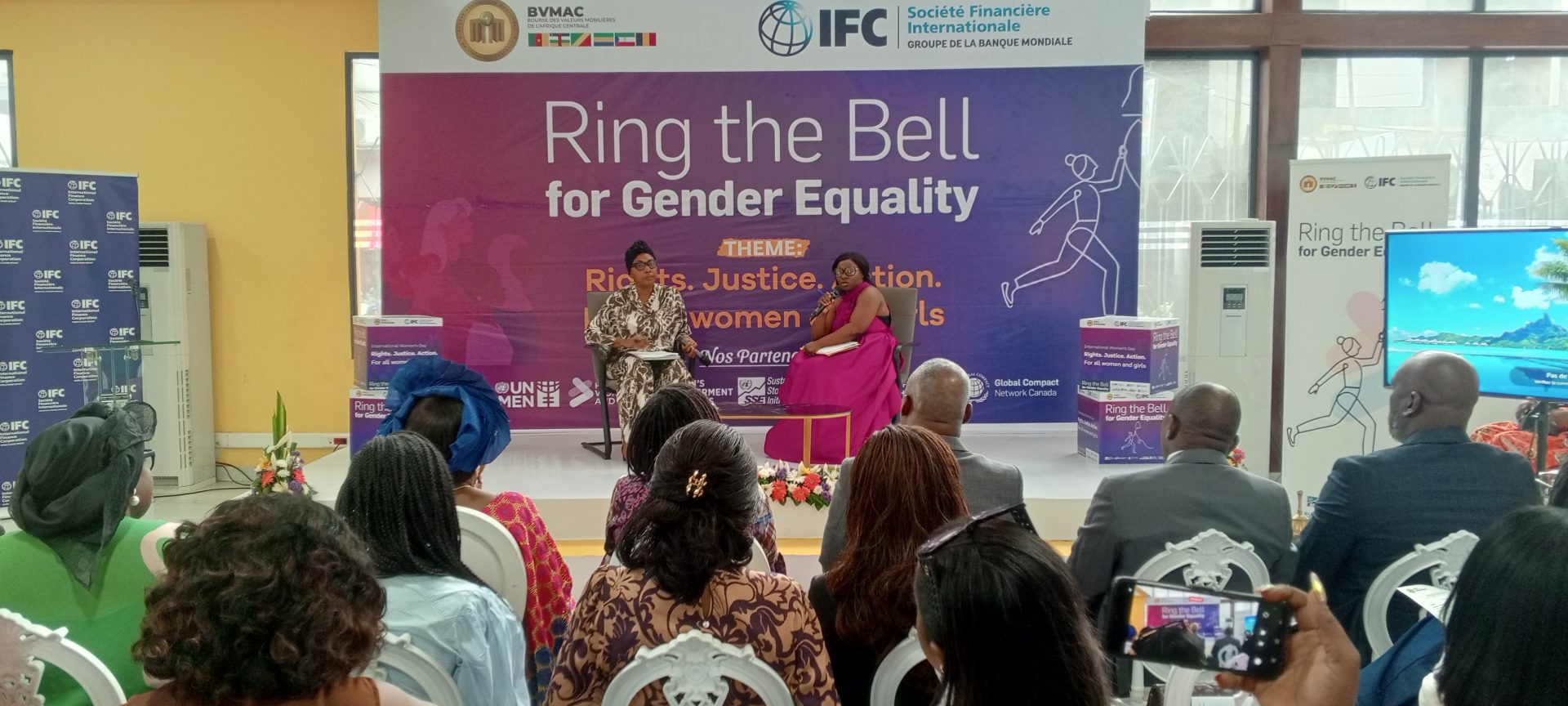 Ce vendredi 6 mars 2026, la Bourse des Valeurs Mobilières de l’Afrique Centrale (BVMAC) à Douala a été le théâtre d’une manifestation d’importance inédite : la célébration de la 12ème édition de l’initiative « Ring the Bell for Gender Equality » (RTB 2026). Grâce à la collaboration entre la BVMAC et la Société Financière Internationale (IFC) – membre du Groupe de la Banque Mondiale – cet événement a pris la forme d’un fireside chat réunissant divers intervenants sur le thème évocateur « DROITS. JUSTICE. ACTION. POUR TOUTES LES FEMMES ET LES FILLES ».