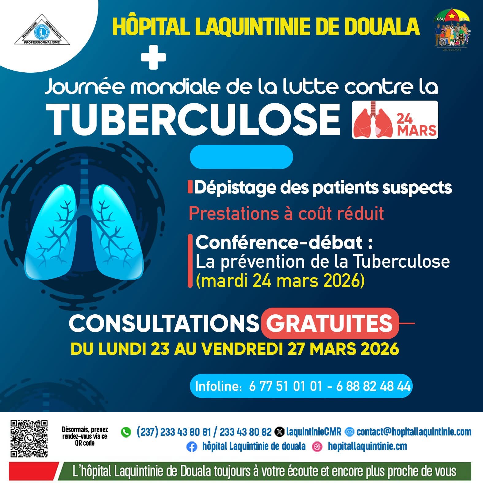 Le 24 mars 2026, à partir de 13h00, l’Hôpital Laquintinie organisera également une conférence-débat sur la prévention de la tuberculose, qui se tiendra dans la salle de conférence Dr Manaouda Malachie. Ce moment d’échange se veut à la fois informatif et éducatif, offrant aux participants l’opportunité d’en apprendre davantage sur les modes de transmission de la maladie, les méthodes préventives ainsi que l’importance d’un suivi médical assidu. La sensibilisation est un outil crucial dans la lutte contre la tuberculose, car elle permet de dépasser les idées reçues et de mieux comprendre l’impact de cette maladie sur la santé publique.