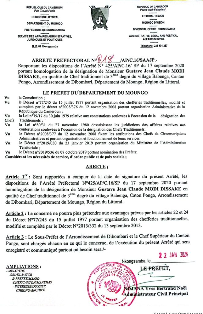 En date du 15 juillet 1977, la loi organisant les chefferies traditionnelles a été promulguée pour encadrer la désignation des chefs traditionnels tout en maintenant l’ordre public et la paix sociale. Ainsi, l’action du sous-préfet de Dibombari ne s’inscrit nullement dans une quelconque démarche d’illégalité ou de favoritisme, mais répond à un arrêté du Préfet du département du Moungo, lequel est parfaitement authentique.