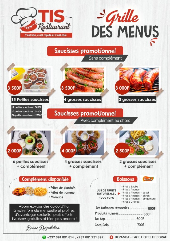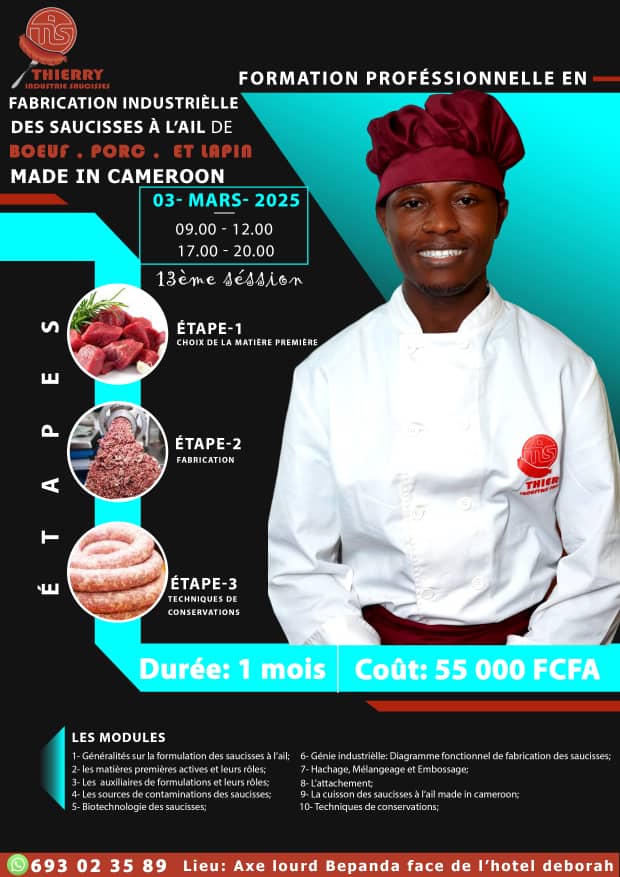 Thierry Tsopmo, jeune biochimiste de vingt-sept ans, se voue à une ambition exaltante : offrir une alternative authentique et raffinée aux géants de la restauration rapide, en sublimant le saucisson « Fabriqué au Cameroun ». Auréolé d’une formation pointue en nutrition et sécurité alimentaire, ce jeune entrepreneur a métamorphosé sa passion en une entité florissante, TIS Sarl, qui élabore et distribue depuis trois ans des saucisses artisanales, des jus de fruits naturels et des savons écologiques à Douala. En dépit des vicissitudes, l’ardeur de Thierry demeure inébranlable, nourrie par une vision audacieuse : instaurer un concept de restauration ciblée sur des saucisses de qualité supérieure, défiant ainsi les enseignes internationales.